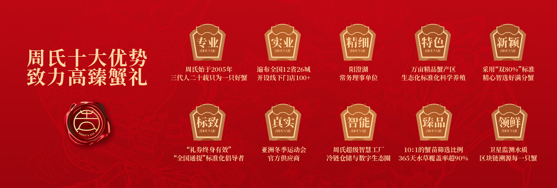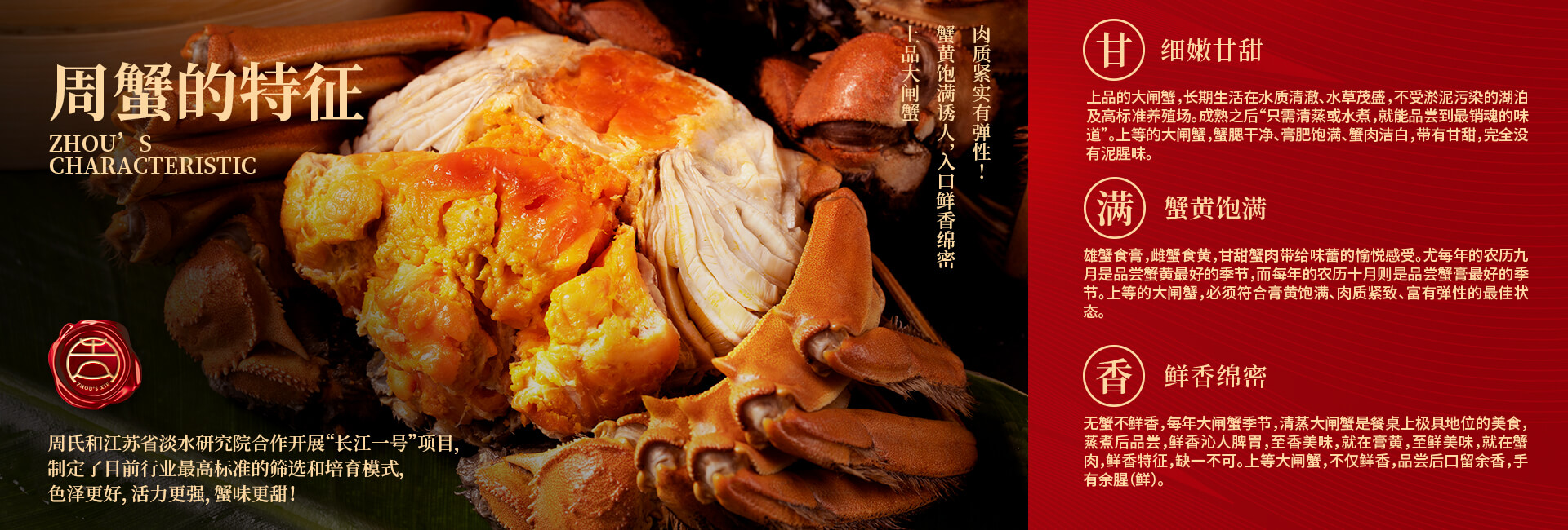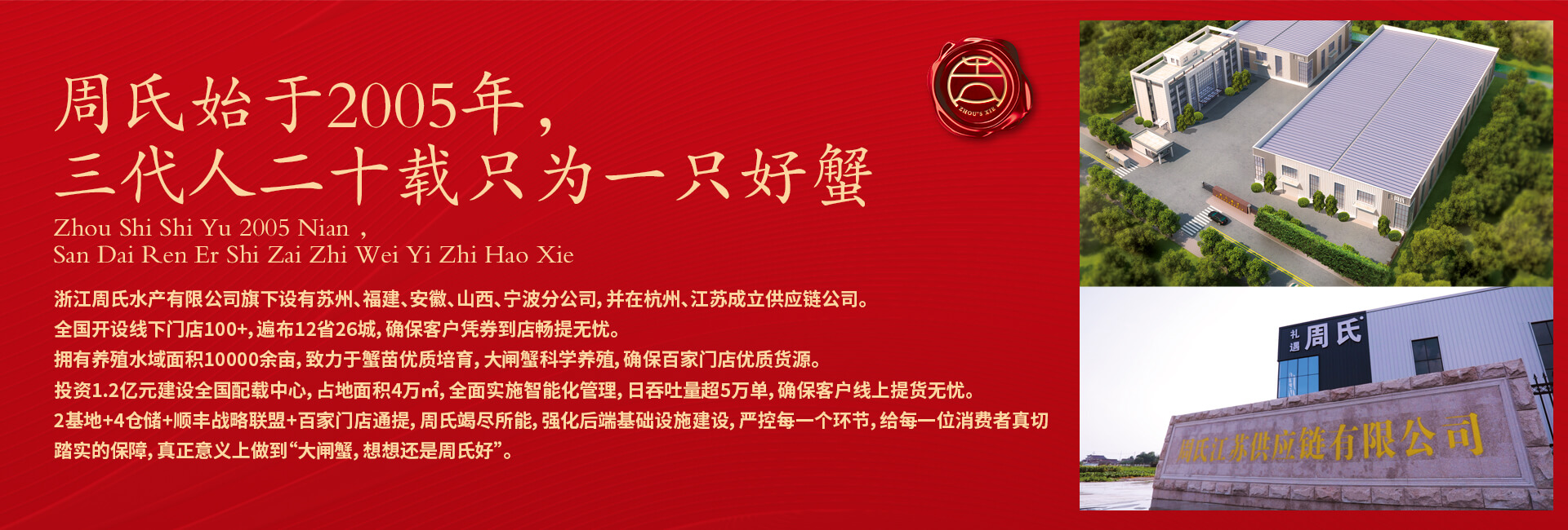 周氏水產(chǎn)精品大閘蟹,14年匠心沉淀,全國87家直營(yíng)門店,100只大閘蟹只精選最優(yōu)50只。不虛標(biāo)規(guī)格,不玩???